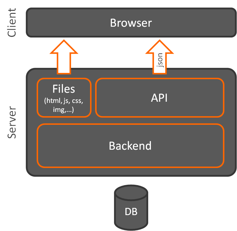An application uses a client side architecture when most or all UI-related work is done by the browser. Generally speaking, the server exposes an API (often RESTful) that returns data (typically JSON). This time it is the job of the client to construct the page: it needs to fetch the data from the server and insert the data into the HTML using DOM manipulation. This is where JavaScript comes into play.
