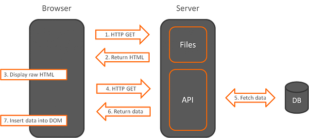 Next, the browser performs one or more asynchronous GET requests to the API of the server to fetch the data. The server retrieves the data from the database and returns it to the browser. Finally the browser inserts the data into the HTML (DOM manipulation).