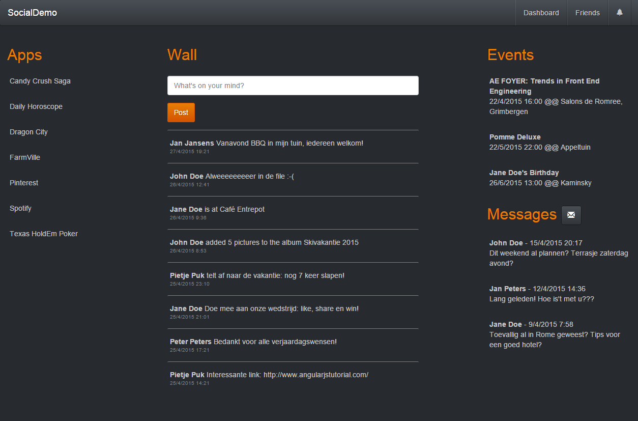 The demo application is a basic Facebook-like app. The main page is the Dashboard. Here you can find installed apps, upcoming events, messages and a news feed. There is also a Friends page where you can search for specific people in your network.