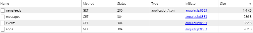 Resources like apps, events and messages rarely change and can therefore be cached server-side. When a user browses to the website, only the news feed needs to be fetched from the database. For the other 3 requests, the server returns a 304 – Not Modified. The browser can retrieve the data from its own cache and no data is transferred over the network.