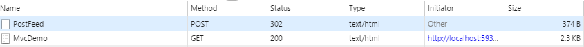 Let’s try something else: posting to the wall. Looking at the network traffic of the MVC app, we see that the browser makes 2 requests. The first one sends the new wall post to the server. The response is an HTTP 302 - a redirect to the second request. This request retrieves the entire HTML of the resulting page.
