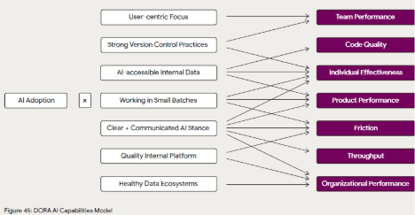 note 1: the former more elaborate DORA capabilities model identifies a larger set of proven practices in a more traditional software delivery-context. note 2: We can expect this new AI-specific capability model to steadily grow together with ongoing research. - The “socio-cognitive” impact - AI has not meaningfully impacted how developers experience their work lives. It’s important however to remain cautious and make sure they continue to find value in their work.
